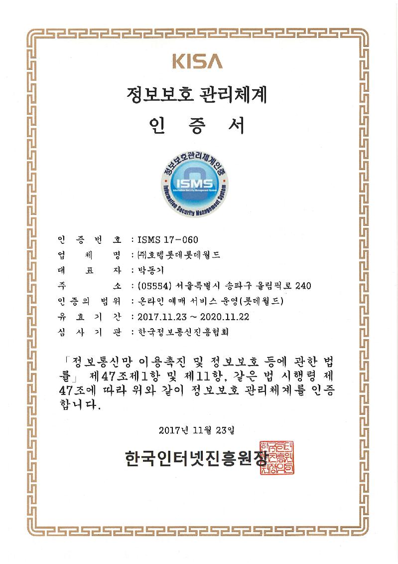 롯데월드는 인증심사에 앞서 정보보호 전담조직을 신설, 개인정보 관련 정기 교육을 진행하고 점검을 확대 실시하는 등 체계적인 정보보안 구축을 위해 힘써왔다. 2월부터 약 9개월간의 탄탄한 준비 과정을 거친 결과 롯데월드는 온라인 예매 서비스 운영 전반에 대한 정보보호 관리체계 인증을 획득할 수 있었다.