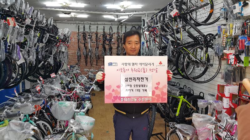 [미디어타임즈= 이옥수 기자] 용인시 수지구 풍덕천2동은 15일 삼천리자전거 수지점에서 연말연시 이웃돕기 운동인 ‘사랑의 열차 이어달리기’에 자전거 11대를 기탁했다고 밝혔다.