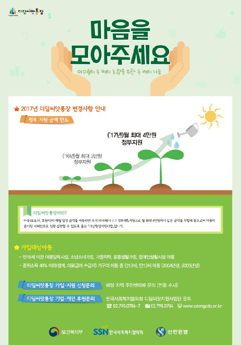 유재홍 여성아동과장은 “디딤씨앗통장 지원 사업은 취약계층 아동의 자산형성을 도와 빈곤의 대물림을 끊고 준비된 사회인으로 나갈 수 있도록 돕는 사업으로, 실제 대학진학 및 주거마련에 많은 아동들이 도움을 받고 있다”며, “생활고 등으로 저축률이 저조한 아동들에게는 작은 관심과 더불어 1:1 후원이 이어진다면 큰 도움이 될 것이다”라고 전했다.