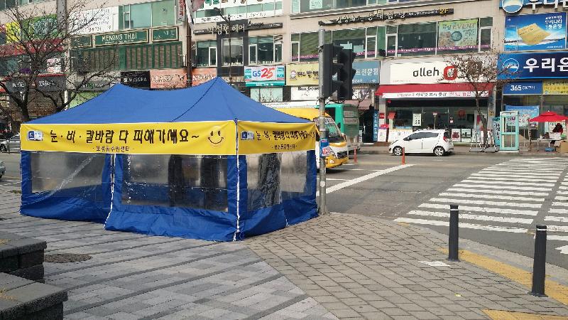 신호를 대기하는 시민들이 바람이나 눈, 비를 피할 수 있도록 동 주민센터의 공공비품인 텐트를 사용해 쉼터를 마련한 것이다.