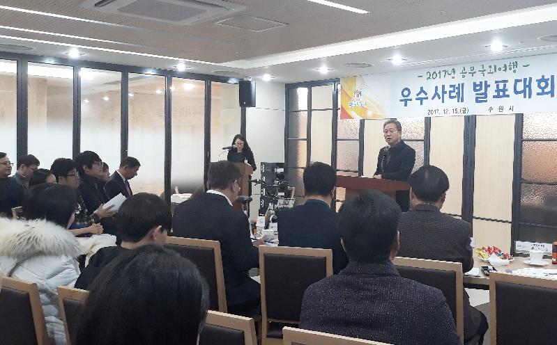 수원시는 15일 수원시청 선마루에서 ‘2017 국외 벤치마킹 우수사례 발표회’를 열고, 한 해 동안 해외 선진지역 출장을 통해 이뤄진 우수 벤치마킹 사례와 성과를 공유했다.