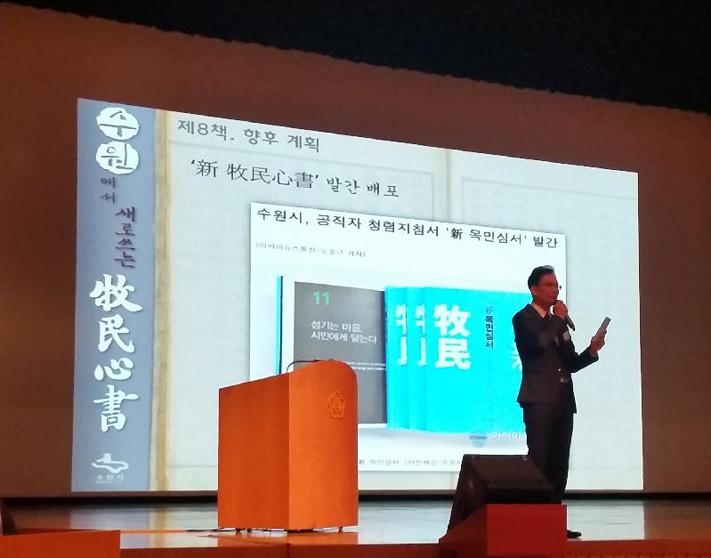 유원종 감사팀장이 발표자로 나선 수원시는 ‘수원에서 새로 쓰는 목민심서’라는 주제로 자율적 내부통제를 공무원 조직내에 안정적으로 조기에 정착시키기 위해 투자한 수원시의 노력과 열정을 차분하고 호소력 있는 어조로 설명했다. 또한 수원시만의 독특한 시장실 기록사관제 운영, 청렴블루카드, 新 목민심서 제작 등을 소개해 큰 박수를 받았다.