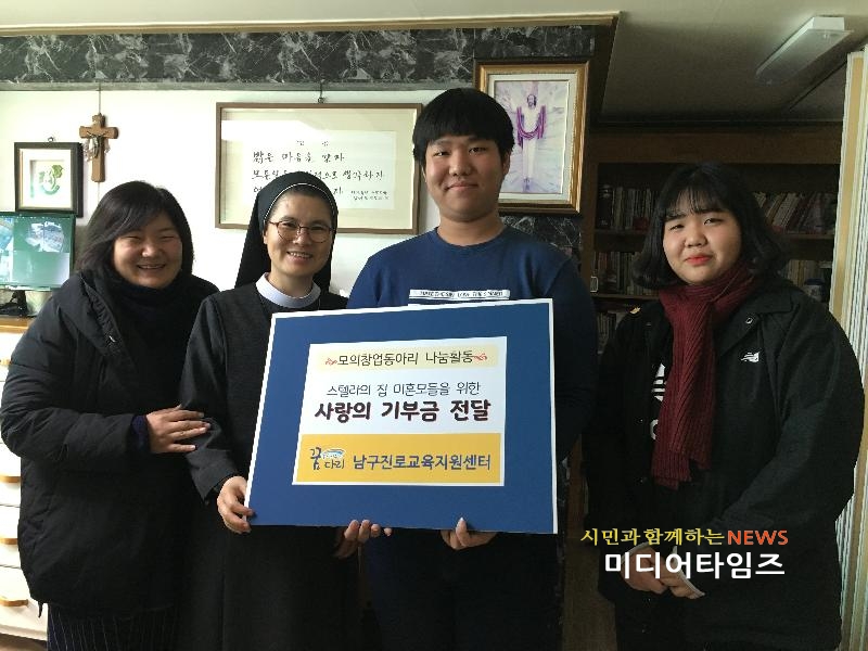 [미디어타임즈=문상수 기자] 인천 남구진로교육지원센터 청소년 모의창업동아리 ‘꿈다리컴퍼니’는 지난 16일 미혼모 시설 ‘스텔라의 집’에 20여만원을 기부했다.2016년 창단된 꿈다리컴퍼니는 미혼모 등 사회적 약자를 돕기 위해 부엉이배지와 보늬팔찌를 제작‧판매해왔다.중학교 2학년부터 고등학교 1학년까지 11명의 학생들로 구성된 이들 동아리는 새로운 창업아이템을 계속 개발하는 등 창업동아리다운 활동을 이어가고 있다.꿈다리컴퍼니에 관심 있는 주민은 남구진로교육지원센터(☎ 880-7347)로 연락하면 된다.