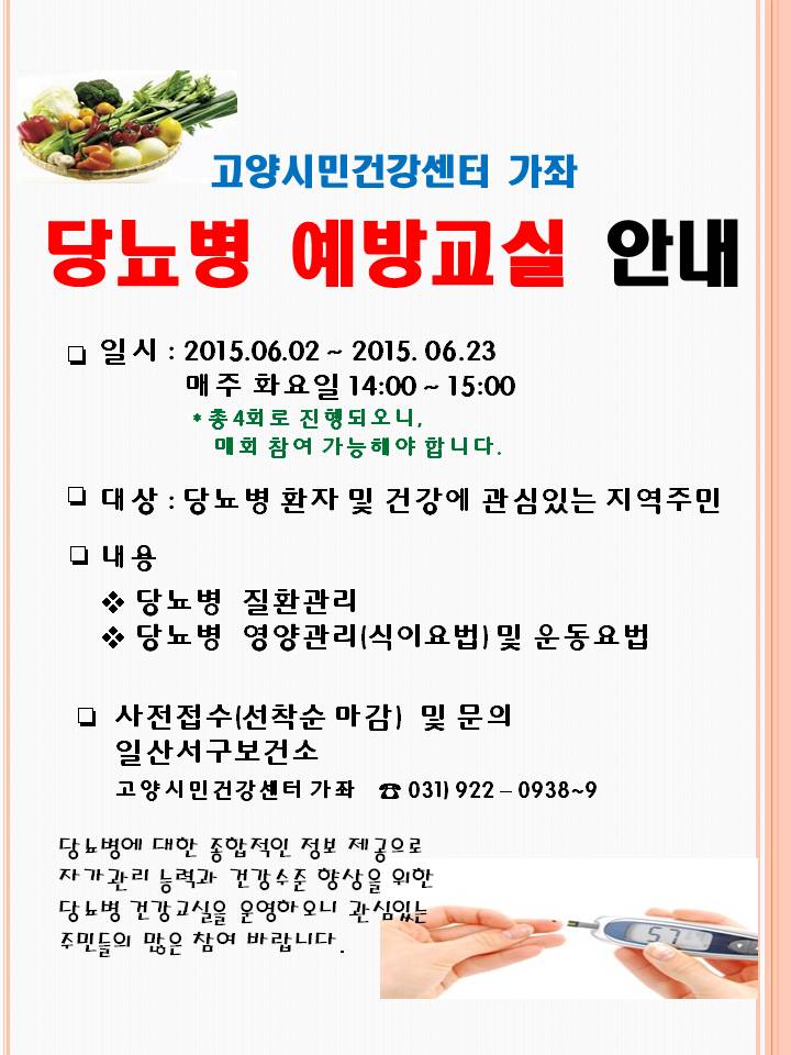 고양시(시장 최성) 일산서구보건소는 고양시민건강센터 가좌에서 6월 한 달 동안 매주 화요일 ‘당뇨병예방교실’을 운영한다고 밝혔다.