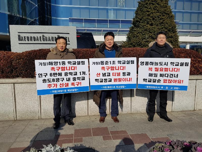 그간 인천의 개발지역 등 인구유입으로 초·중·고의 과대·과밀학급이 예상되고 학습권과 교육여건 개선을 위해 자녀를 둔 학부모의 심정을 담아 학교신설이 반드시 필요하다는데 뜻을 모아 인천시의회 공병건의원, 김정헌의원, 정창일의원은 교육부 중앙투자심사위원회가 열리는 부산광역시 해운대구 현장을 방문하여 초·중·고 학교신설을 촉구했다.