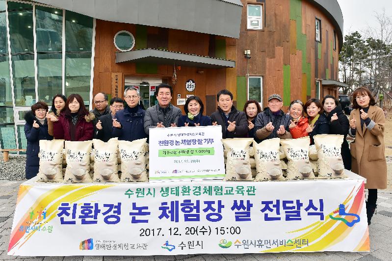 이날 기부한 쌀은 시가 운영하는 ‘친환경 논체험장’(권선구 호매실동) 내 개구리논에서 한 해 동안 시민들이 힘을 모아 전통 유기농 방식으로 재배한 것이다.