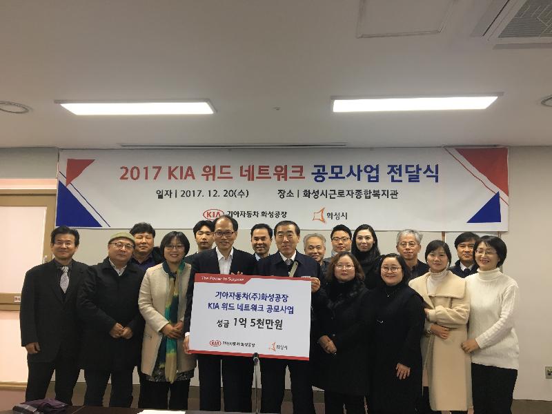 [미디어타임즈= 신훈종 기자] 화성시와 기아자동차 화성공장이 20일 화성근로자종합복지관에서 ‘기아 위드 네트워크 공모사업’ 선정기관 지원금 전달식을 개최했다.