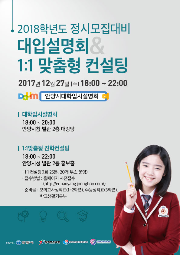 [미디어타임즈= 신훈종 기자] 안양시(시장 이필운)는 오는 27일 오후 6시 안양시청 대강당에서 2018학년도 정시모집대비 대입설명회, 1:1 맞춤형 컨설팅을 개최한다.