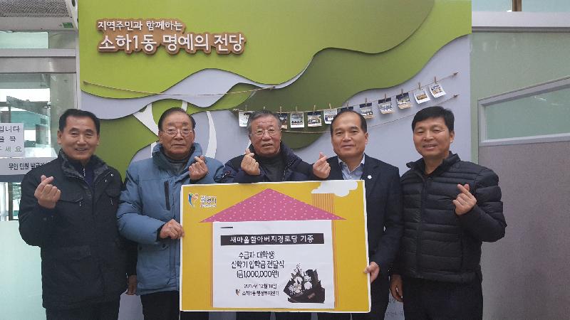 올해에도 지난 18일 새마을할아버지 경로당 남상종 회장과 회원들이 소하1동 행정복지센터를 찾아와 소외계층에게 희망을 줄 수 있는 일에 써달라며 현금 100만원을 전달했다. 이날 전달된 후원금 100만원은 취지에 맞게 기초생활수급자 2가정의 대학생을 위한 대학교 입학금으로 각 50만원씩 지원될 예정이다.