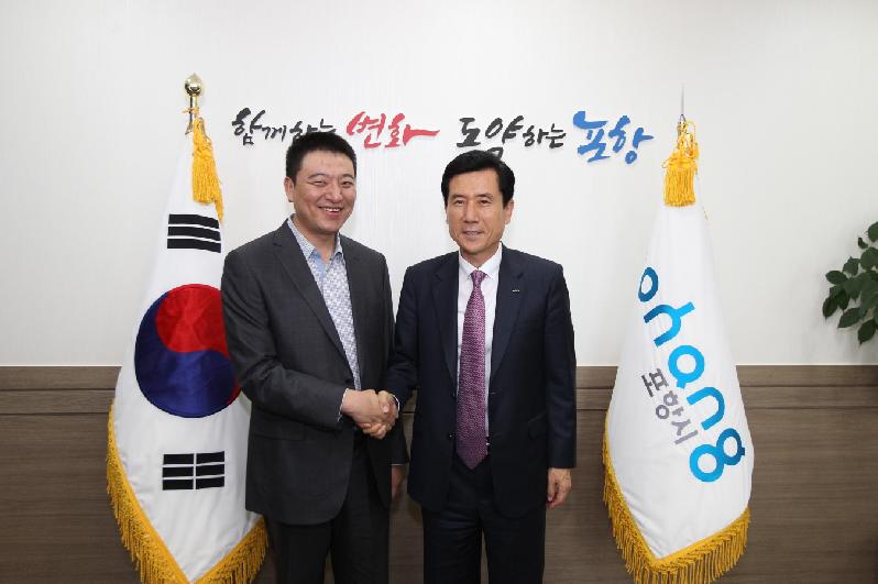| (사진 왼쪽부터)구천그룹 리하이위 회장과 이강덕 포항시장. |