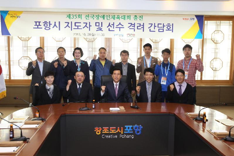 포항시는 26일 중회의실에서 전국장애인체육대회에 경북대표로 출전하는 포항시소속 선수, 지도자 등 15명이 참석한 가운데 간담회를 가졌다. 이 자리에서 이강덕 시장은 “28일부터 열리는 대회를 앞두고 막바지 훈련에 전념해야 될 소중한 시간에 자리를 함께해 준데 대해 감사드린다”며 “임원, 선수 여러분들은 포항시 대표로써 자부심을 갖고 모든 선수들이 부상없이 최상의 컨디션으로 최선을 다하여 스포츠를 통해 창조도시 포항의 도시브랜드를 드높이는데 앞장서 주길 바란다”고 말했다. 또한 박정민 유도 코치의 장애인체육관 건립 건의에 대해 “경북도내 전체 장애인의 15%를 차지하는 포항에 장애인을 위한 체육관이 없어 내내 안타깝게 생각했다”며 “전용체육관이 반드시 건립될 수 있도록 행정지원을 아끼지 않겠다”고 말했다. 한편, 제35회 전국장애인체육대회는 10월 28일부터 11월 1일까지 5일간 체전역사상 처음으로 전국체육대회가 열린 강원도 일원에서 개최되며, 경북선수단은 448명(남 329, 여 119)으로 이 가운데 포항시는 15개 종목 74명(남 54, 여 20)이 참가하게 된다.// 심후보 기자