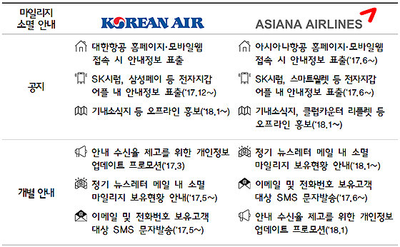 먼저 양대 항공사의 마일리지가 처음으로 소멸되는 점을 고려해 온라인과 오프라인에서도 관련 내용을 안내한다.