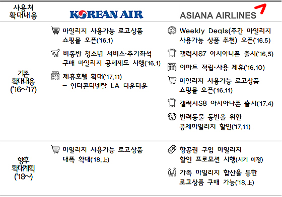 한편, 국토부와 양 항공사는 마일리지 소멸에 대비해 지난 2015년 12월 마일리지 사용제고 방안을 발표한 바 있고 이후 항공사는 꾸준히 마일리지 사용처를 확대해왔다.