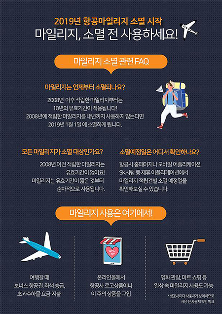 국토교통부는 2019년부터 시작되는 항공마일리지 소멸을 앞두고 소비자들의 마일리지 사용을 독려하기 위해 대한항공과 아시아나항공사와 함께 마일리지 소멸안내 및 사용처 확대내용을 20일 발표했다.