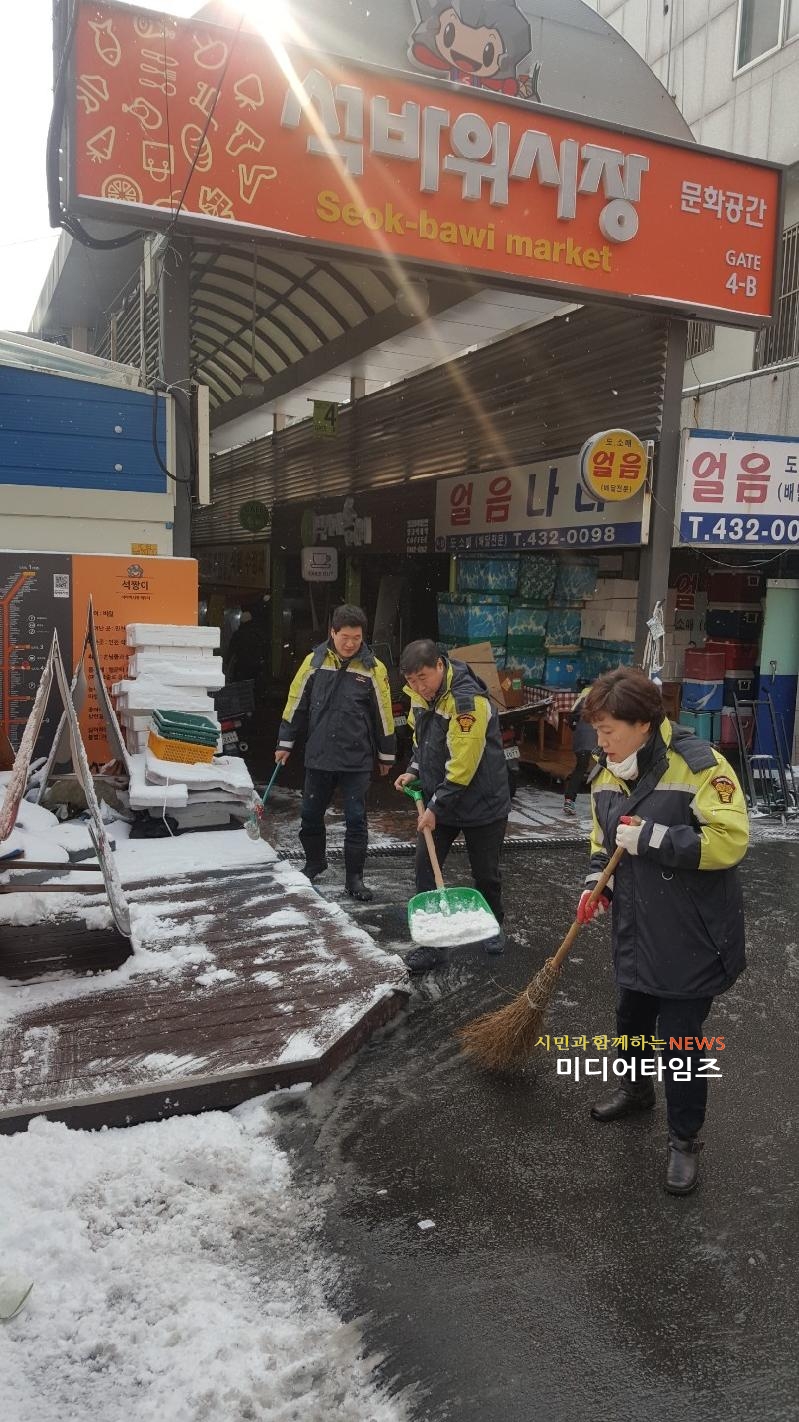 [미디어타임즈=문상수 기자] 인천남부소방서(서장 류환형) 의용소방대는 지난19일 갑작스럽게 눈이 내린 후 매서운 한파로 인하여 얼어붙은 빙판길에 대한 안전관리에 발 벗고 나서 시민들의 실생활과 밀접한 관련이 있는 생활안전 확보에 만전을 기했다..남구에 위치한 석바위시장 등 불특정 다수가 이용하는 곳과 구청 및 소방관서 등 공공기관의 손길이 상대적으로 닿기 어려운 낙후된 고지대 주택밀집지역과 급경사 지역 등에 대하여 의용소방대원 40여 명이 동원되어 염화칼슘 및 연탄재 등을 사용, 위해요소 사전 제거활동을 실시했다. 의용소방대 연합회장은 “맹추위가 기승을 부리는 요즘 같은 때에 혹시라도 빙판길에서 발생할 수 있는 낙상 사고 등 각종 안전사고를 조금이라도 줄이고 예방하기 위하여 앞으로도 더욱 노력할 것”이라고 전했다.