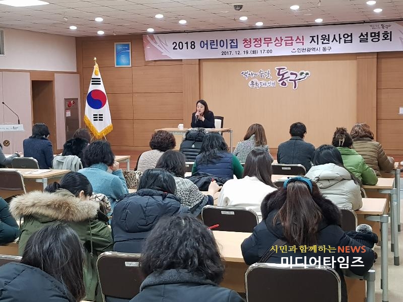 [미디어타임즈=문상수 기자] 인천 동구(구청장 이흥수)는 지난 19일, 구청 지하대회의실에서 어린이집 원장 50여명이 참여한 가운데 2018년 어린이집 청정무상급식 사업설명회를 개최했다. ‘청정무상급식 지원사업’이란 어린이집이 급식재료 공동구매를 통해 양질의 급식재료를 확보하고 영유아에게 제공되는 급·간식의 품질을 개선할 수 있도록 지원하는 인천시 행·재정 지원 사업이다. 이번 사업설명회는 어린이집 원장들을 대상으로 어린이집 급식재료 공동구매 제도 활성화를 통해 급․간식의 질을 제고하고, 정부미지원 어린이집 이용부모의 재정 부담을 완화해 시설유형 간 격차를 완화하고자 하는 사업의 취지를 알리고, 사업의 신청, 구매․납품 방법, 보조금 신청 등 사업의 세부 사업 내용에 대해 설명하는 자리로 마련됐다. 교육에 참석한 A어린이집 원장은 “내년부터 시행될 어린이집 청정무상급식을 통해 아이들에게 조금 더 좋은 급·간식을 제공할 수 있어 기대가 된다.”고 말했으며, B어린이집 원장은 “부모부담보육료를 완화하여 정부미지원 어린이집의 부모님들께 재정 부담을 덜어드릴 수 있는 기회가 될 것 같다.”고 말했다.한편 구 담당자는 “동구의 아이들이 질 좋은 급․간식을 제공받아 건강하게 자랄 수 있도록 행·재정 지원을 아끼지 않겠다.”라고 말했다.