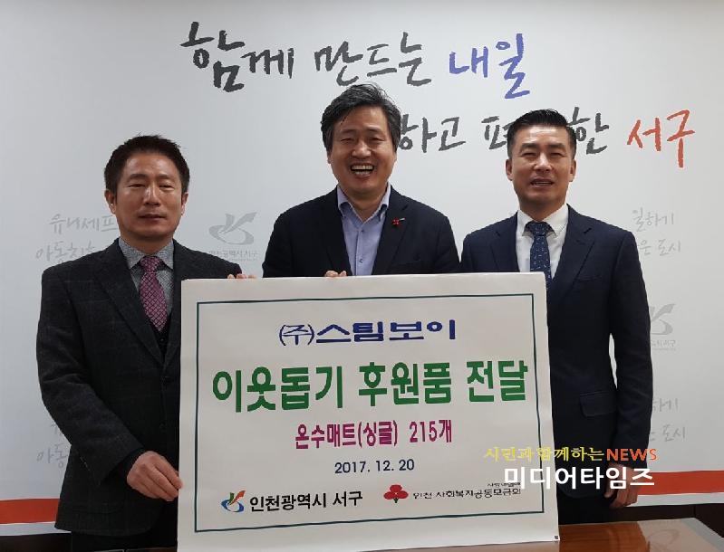 [미디어타임즈=문상수 기자] 인천시 서구 건지로에 소재한 ㈜스팀보이(대표 윤정수)는 지난 20일 연말을 맞아 소외계층을 위한 온수매트(싱글, 215개)를 서구청에 기탁했다. 이번에 기탁된 온수매트는 관내 동 주민센터를 통해 독거노인 등 어려운 이웃들에게 전해질 예정이다.㈜스팀보이는 지난 2월에도 온수매트 (215개)를 어려운 이웃들에게 지원하며 따뜻한 사랑을 전해준 바 있다.강범석 서구청장은 “주변의 어려운 이웃을 위해 아낌없는 지원을 통한 나눔 활동에 앞장서 주신 덕분에 우리 모두가 마음까지 따뜻함을 느낄 수 있는 겨울을 보낼 수 있을 것 같다”며 감사의 인사를 전했다.