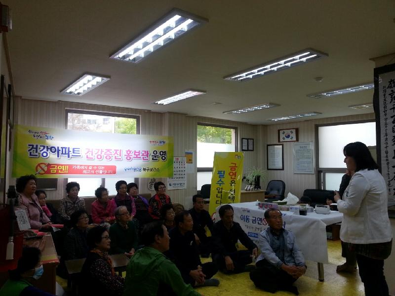 포항시 북구보건소는 23일 건강아파트로 운영 중인 장량휴먼시아 1단지 아파트 노인복지관에서 주민들과 함께 건강증진 홍보관 운영 및 금연캠페인을 실시했다. 이날 캠페인은 북구보건소와 함께 장량휴먼시아 1단지 입주자 주민, 아파트 관리사무소 직원 등 50여명이 합동으로 쾌적하고 건강한 아파트 환경을 만들기 위해 금연홍보 캠페인을 집중적으로 실시했다.