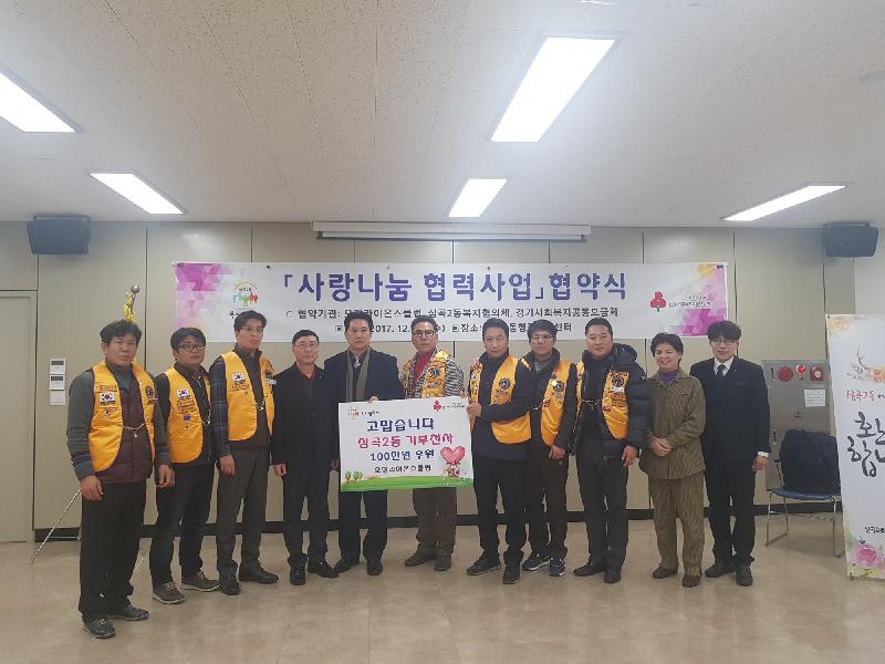 오정라이온스클럽은 이웃사랑을 실천하는 단체로 이번 협약식에서도 지역 내 저소득 주민을 위해 써달라며 100만 원을 기부하였으며 향후 매년 100만 원 상당의 현·물품을 심곡2동 복지협의체에 기부하기로 약속했다.