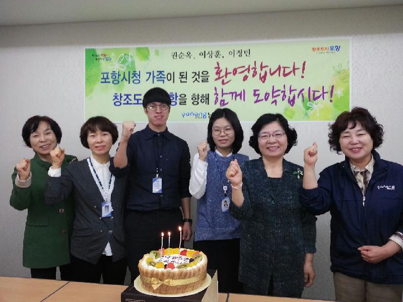 포항시 남구보건소가 지난 23일 공무원으로 첫 발을 내딛게 된 권순옥, 이상훈, 이정민 주무관 등 신규임용 직원에 대한 환영행사를 가졌다.