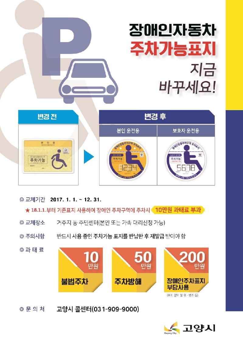 새로운 장애인주차표지 교체는 지난 1월부터 시작됐으며 기존 장애인 주차가능표지에 대한 과태료 유예 기간은 올해 말(2017.12.31.)로 만료된다.