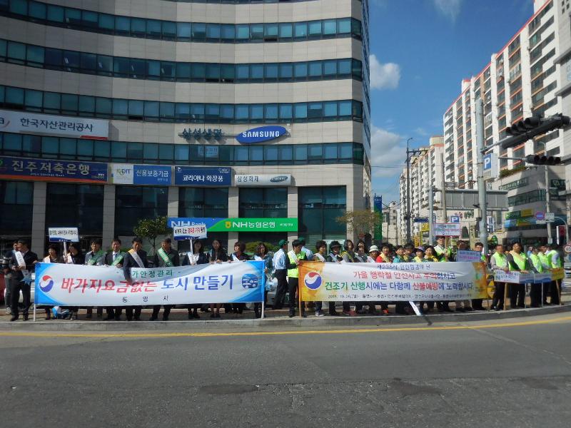 삼성생명 앞 사거리에서 전개한 이번 행사에는 통영소방서, 전기안전공사 경남남부지사, 안전문화협의회, 주부민방위기동대, 의용소방대, 안전모니터봉사단, 지역자율방재단, 교통안전봉사대, 읍면동 자생단체 회원 등 통영시재난안전네트워크 회원 100여명이 참여한 가운데 가을 행락철 및 축제행사시 관광객 증가에 따른 안전사고 예방과 건조기 산행 시 산불예방에 대한 홍보를 겸해 일상생활 속 안전의 중요성을 알리는 대시민 홍보활동을 전개했다.