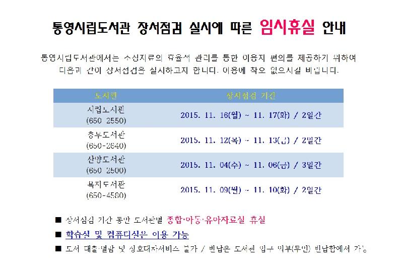 도서관별 장서점검 기간은 ▲산양도서관(11월 4~6일) ▲욕지도서관(11월 9~10일) ▲충무도서관(11월 12~13일) ▲시립도서관(11월 16~17일) 이다.