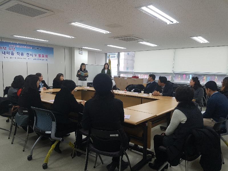 1부 행사로 동 행정복지센터 2층 회의실에서 ‘쓰담쓰담 내마음’ 참여자들의 작품 전시 및 발표회를 열었다. ‘쓰담쓰담 내마음’은 희망드리미협의체가 능곡동 정서소외계층을 대상으로 하는 시흥시1%복지재단 공모사업으로, 지난 10월부터 진행한 정서지원 프로그램이다. 대상자들을 위한 심리상담과 미술치료를 지원하고 희망드리미협의체 위원과 1:1 멘티-멘토를 맺어 대상자들이 지닌 정서적 어려움을 극복할 수 있도록 돕고 있다. 대상자들은 지난 3개월간의 여정을 그린 정성 가득한 작품을 발표하고 그들의 멘토와 함께 마음 치유 과정을 공유하는 시간을 보냈다.