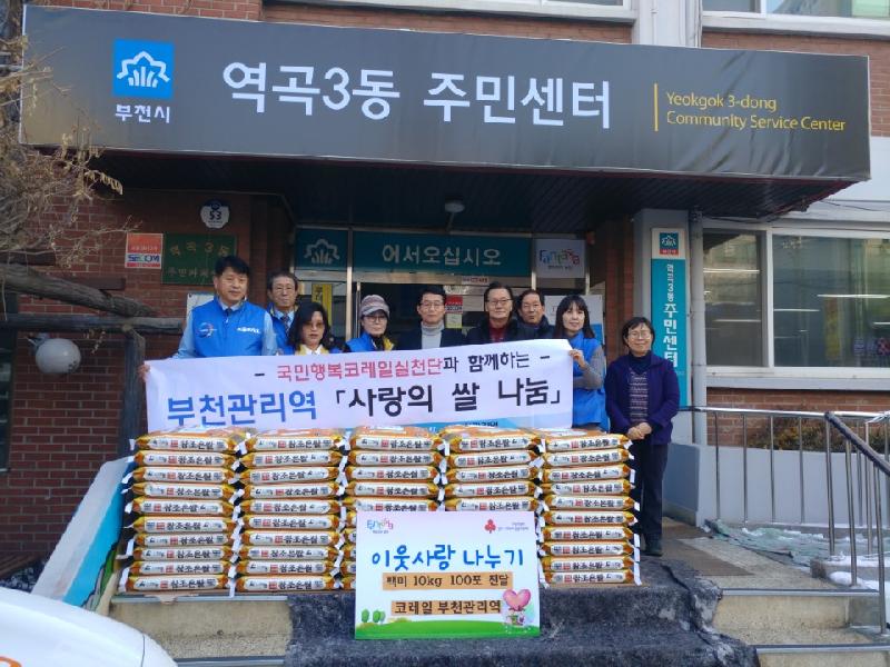 [미디어타임즈= 이옥수 기자] 코레일 부천관리역(역장 주영선)에서는 지난 21일 어려운 이웃에게 전달해 달라며 백미(10kg) 100포를 역곡3동 복지협의체에 기탁하였다.