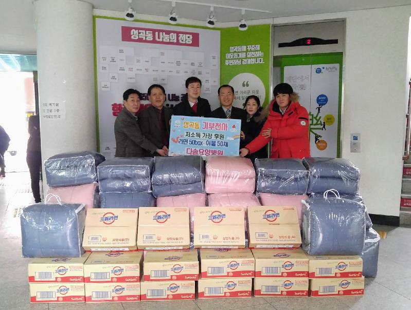 이황구 성곡동장은“따뜻한 마음을 담아 후원물품을 전해준 다솜요양병원에 감사드리며, 후원물품은 꼭 필요한 어려운 이웃에게 잘 전달하여 따뜻한 연말을 보낼 수 있도록 하겠다”고 말했다.