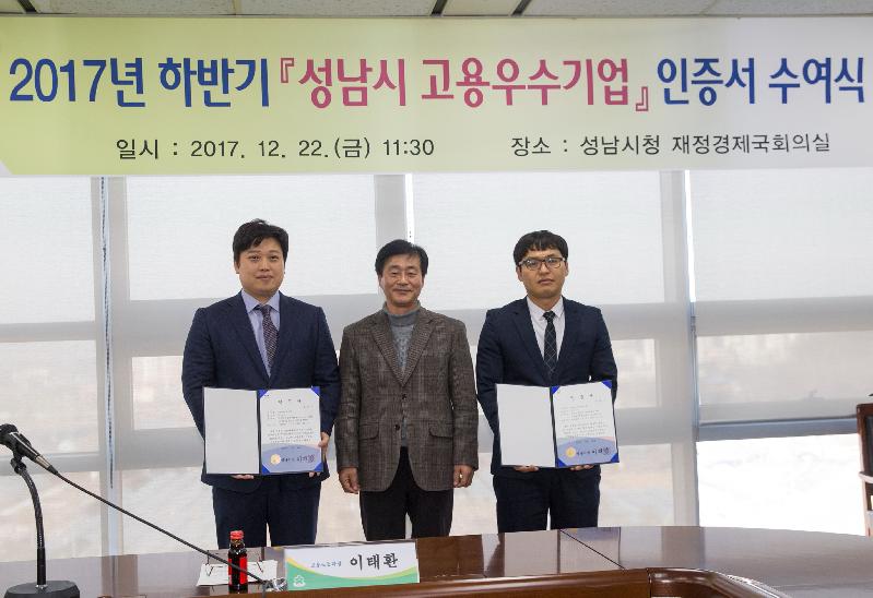 성남시는 이들 2곳 기업 대표에 12월 22일 고용우수기업 인증서와 현판을 줬다.