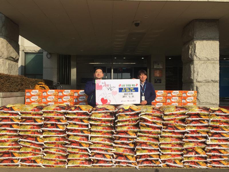 [미디어타임즈= 신훈종 기자] 성우전자(주)(회장 조성면)는 지난 22일 연말 이웃돕기 후원품으로 쌀 20kg 100포와 라면 100박스를 안산시에 기탁했다.