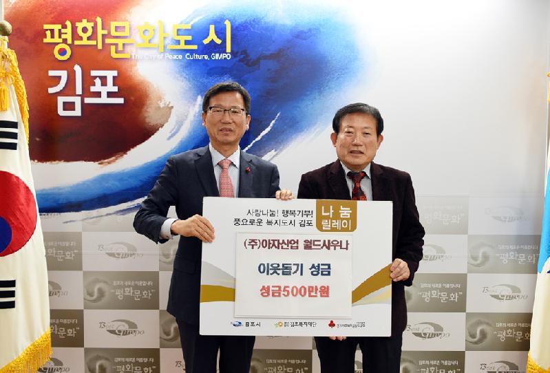 지난 26일 ㈜아자산업 월드사우나(대표자 원만재)는 김포시를 방문해 추운겨울을 나기 어려운 이웃을 위해 써 달라며 성금 500만원을 기탁했다.
