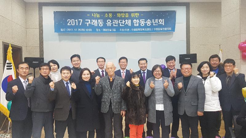 [미디어타임즈= 이옥수 기자] 지난 26일, 구래동 발전협의회(회장 조규진) 주관으로 120여명의 내빈이 참석한 가운데 “2017년 구래동 동정보고 및 유관단체 합동 송년회”가 개최됐다.