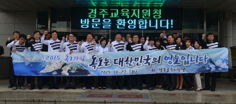 경주교육지원청(교육장 정두락)에서는 ‘독도의 날’을 기념하여 2015.10. 27.(화) 1층 현관 앞에서 일본 문부과학성 역사 교과서 왜곡 규탄 결의 대회를 실시하였다.
