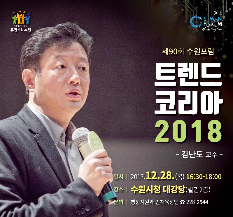 [미디어타임즈= 김광한 기자] 수원시는 28일 오후 4시 30분 수원시청 별관 대강당에서 ‘트렌트 코리아 2018’을 주제로 제90회 수원포럼을 연다.