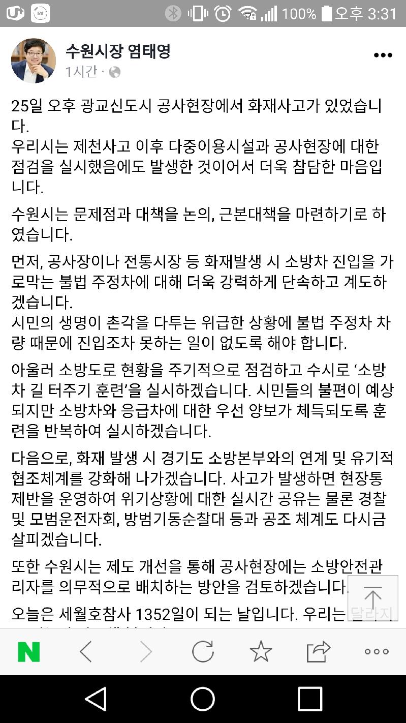 염 시장은 27일 페이스북에 글을 게시하고, “제천 화재 사고 이후 다중이용시설과 공사현장을 대상으로 안전점검을 했지만, 화재 사고가 발생해 더욱 참담하다”면서 화재 사고 후 마련한 안전관리 강화 방안을 설명했다.