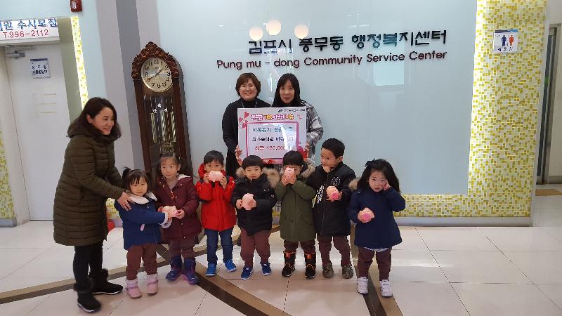 꼬마숲대림 어린이집에서는 18명의 원아와 부모님, 선생님들이 바자회를 통해 마련한 수익금과 4세반 친구들이 그동안 모았던 소중한 돼지저금통을 모아 도움이 필요한곳에 전달하고자 27일 풍무동행정복지센터를 찾았다.