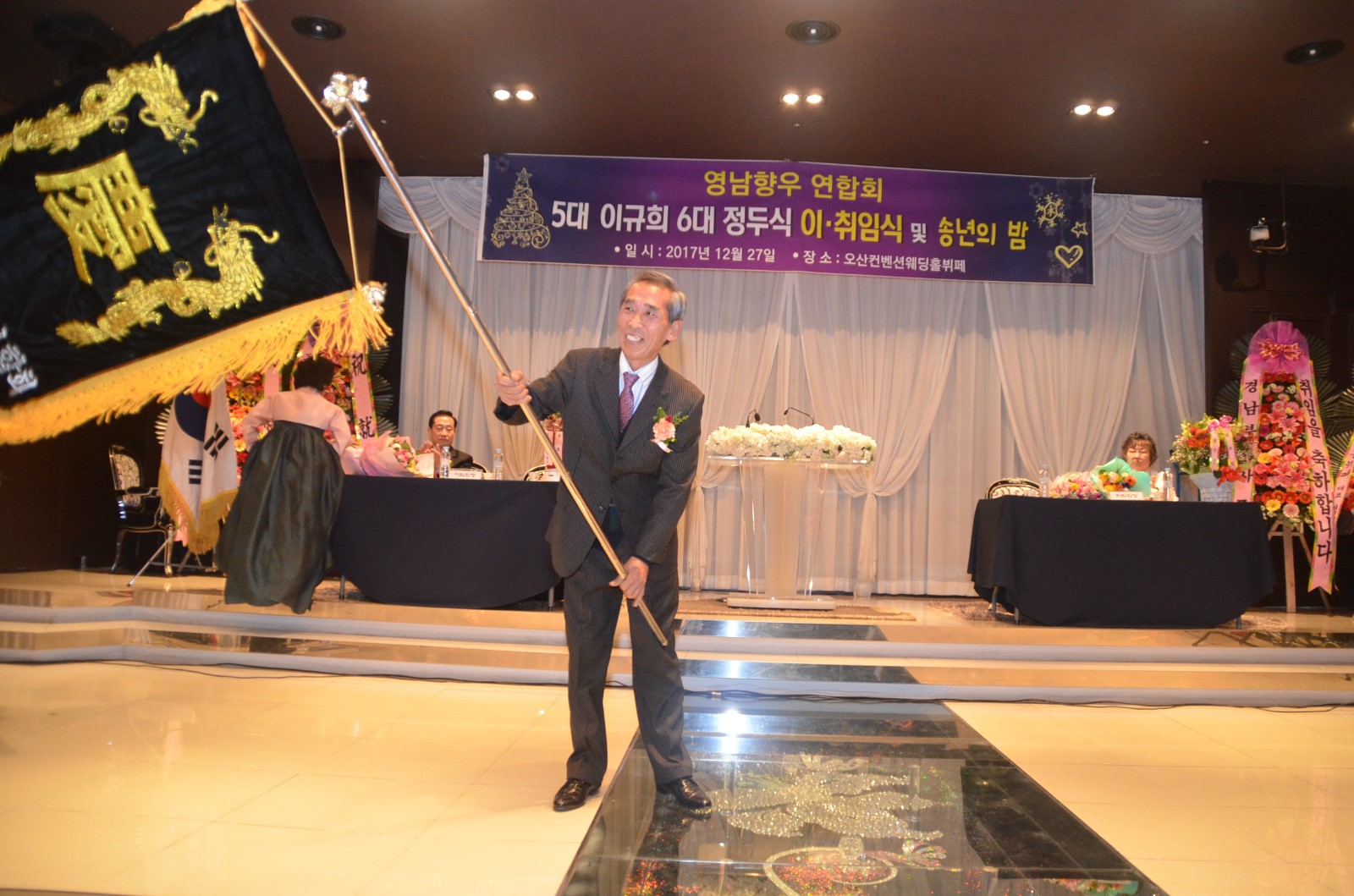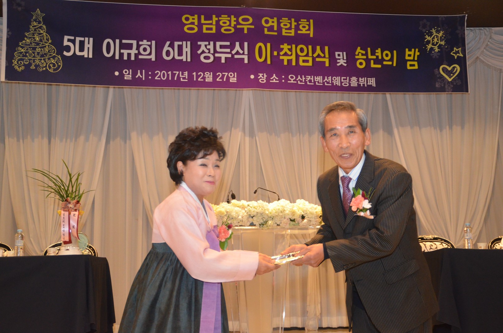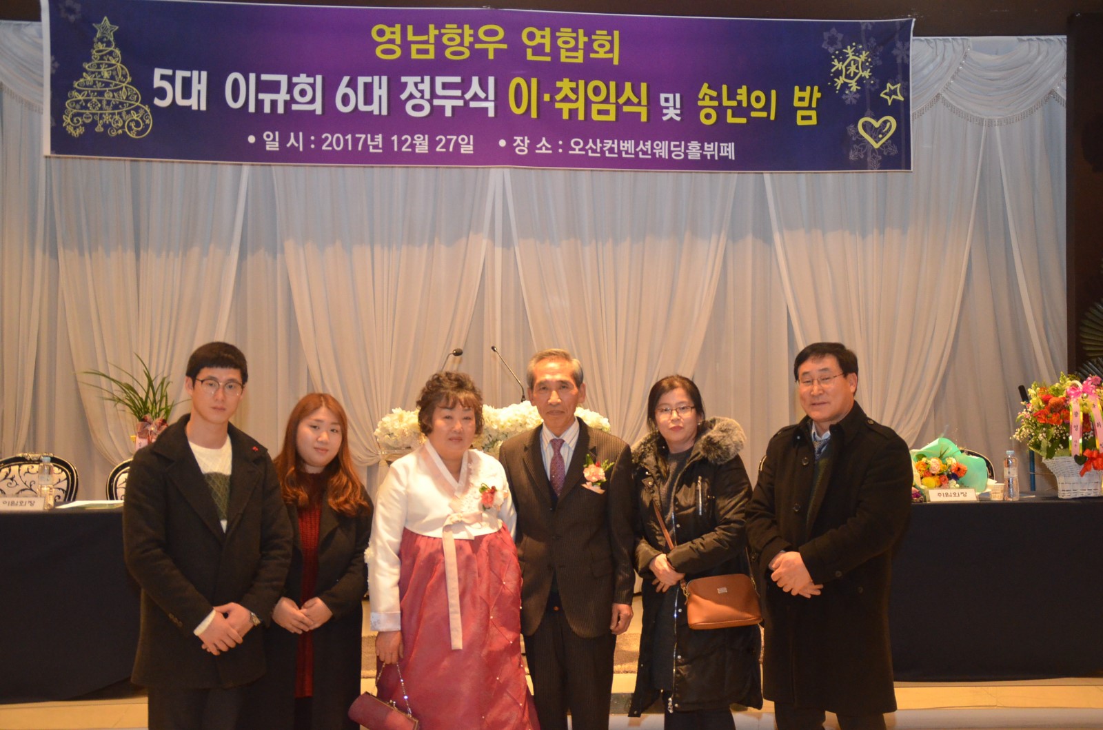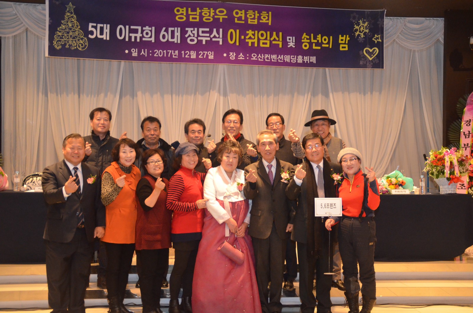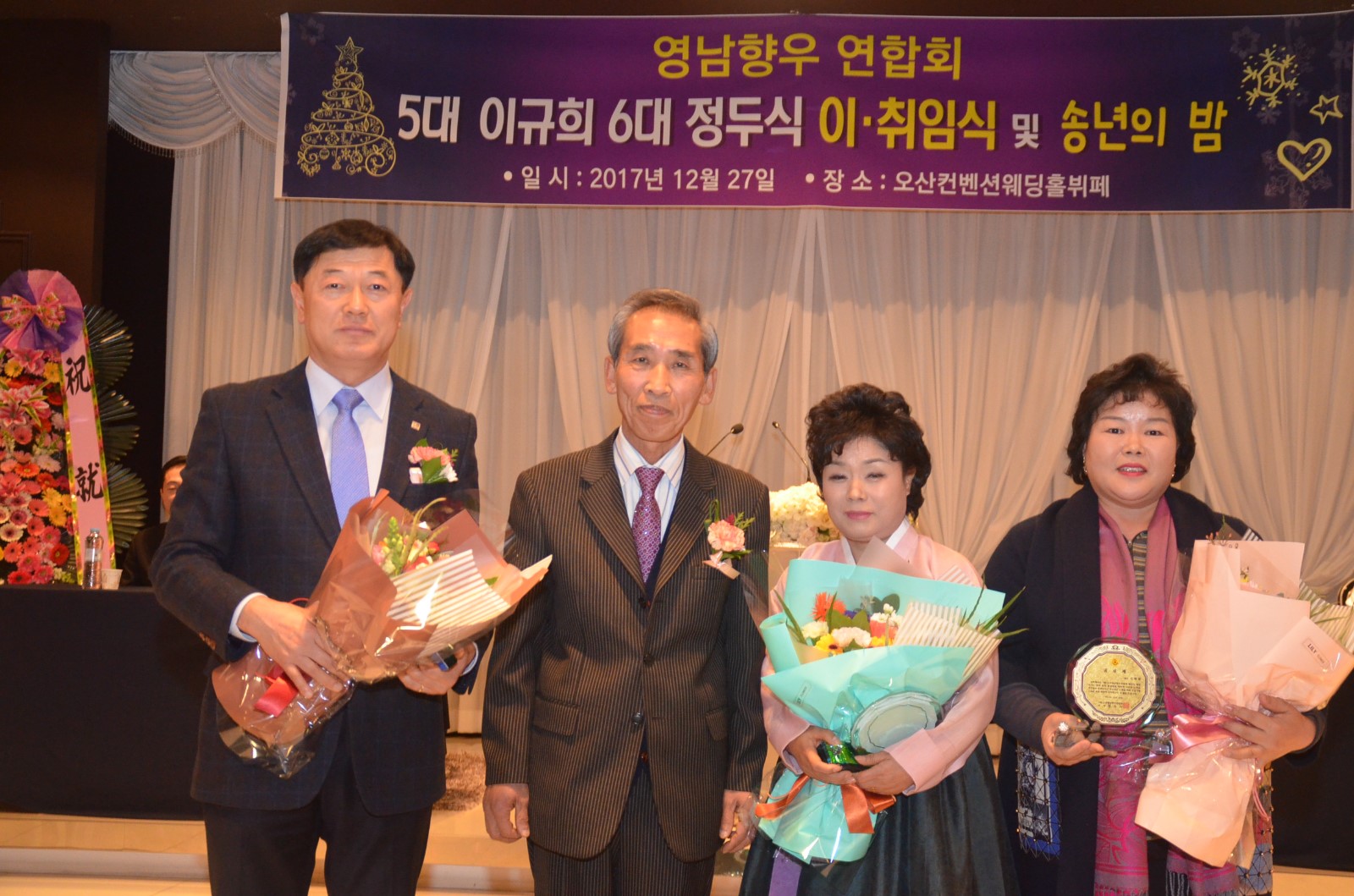 [미디어타임즈= 신훈종 기자] ‘在)오산 영남향우연합회’는 2018년 무술년 새해를 앞두고 지난 27일 오후 7시 오산켄벤션웨딩홀 4층에서 「제5대·6대회장 이˙취임식 및 향인과 함께하는 송년회」를 개최했다.