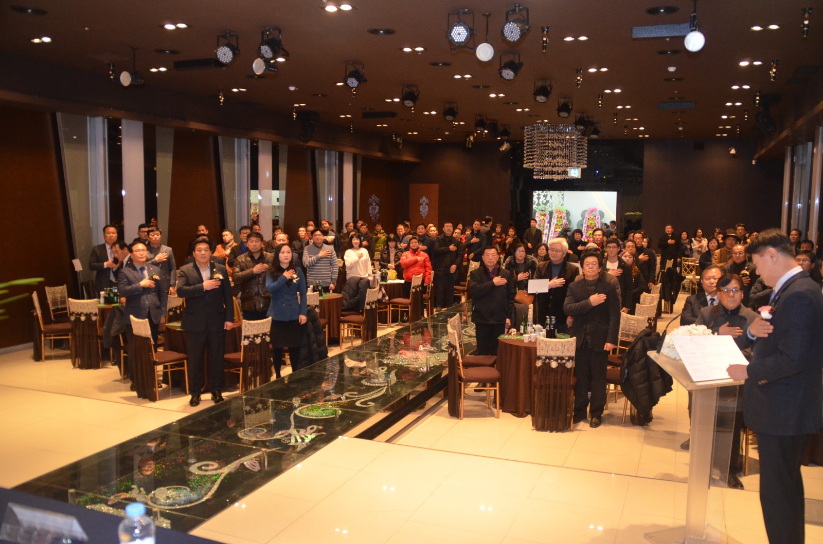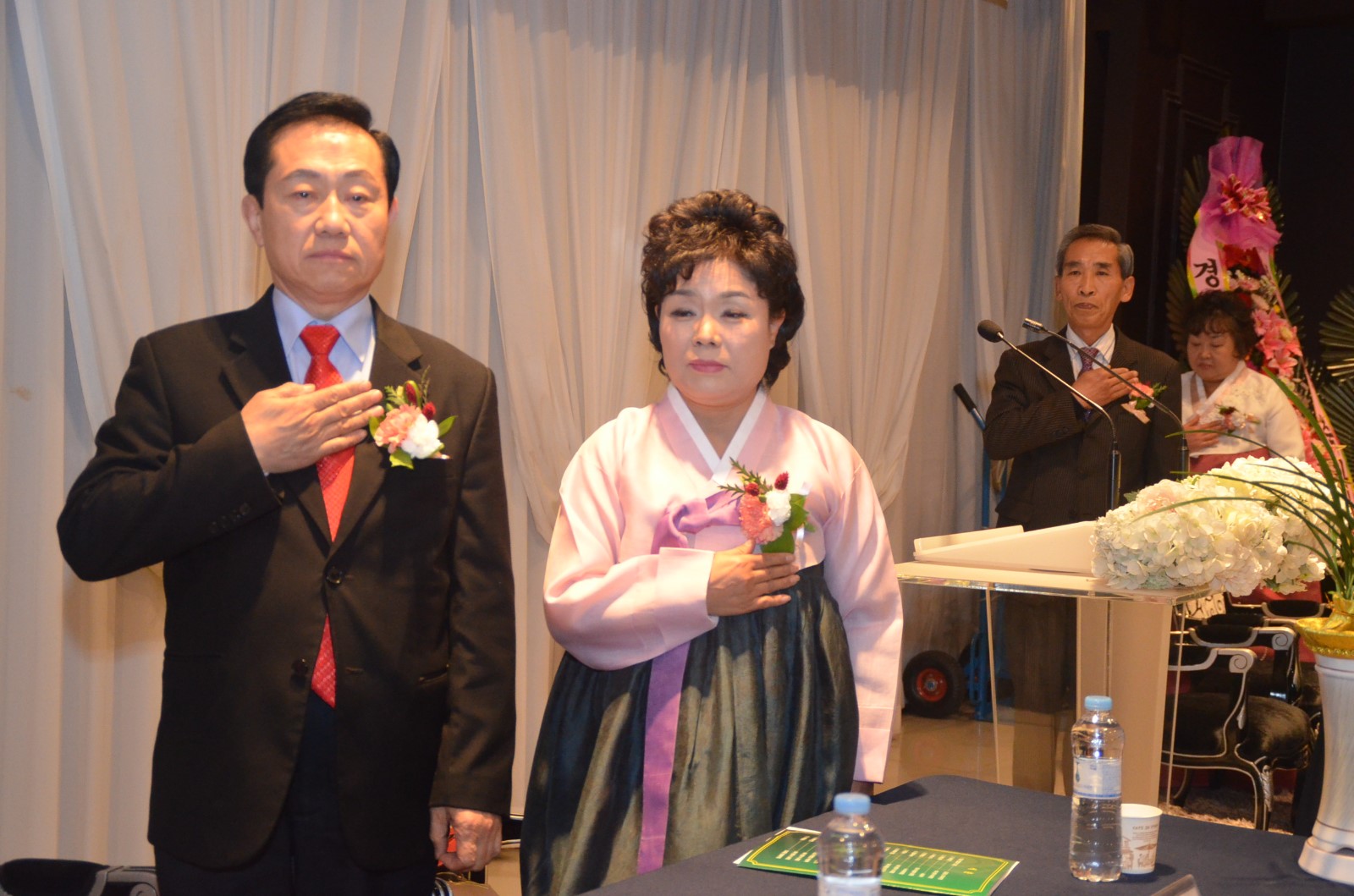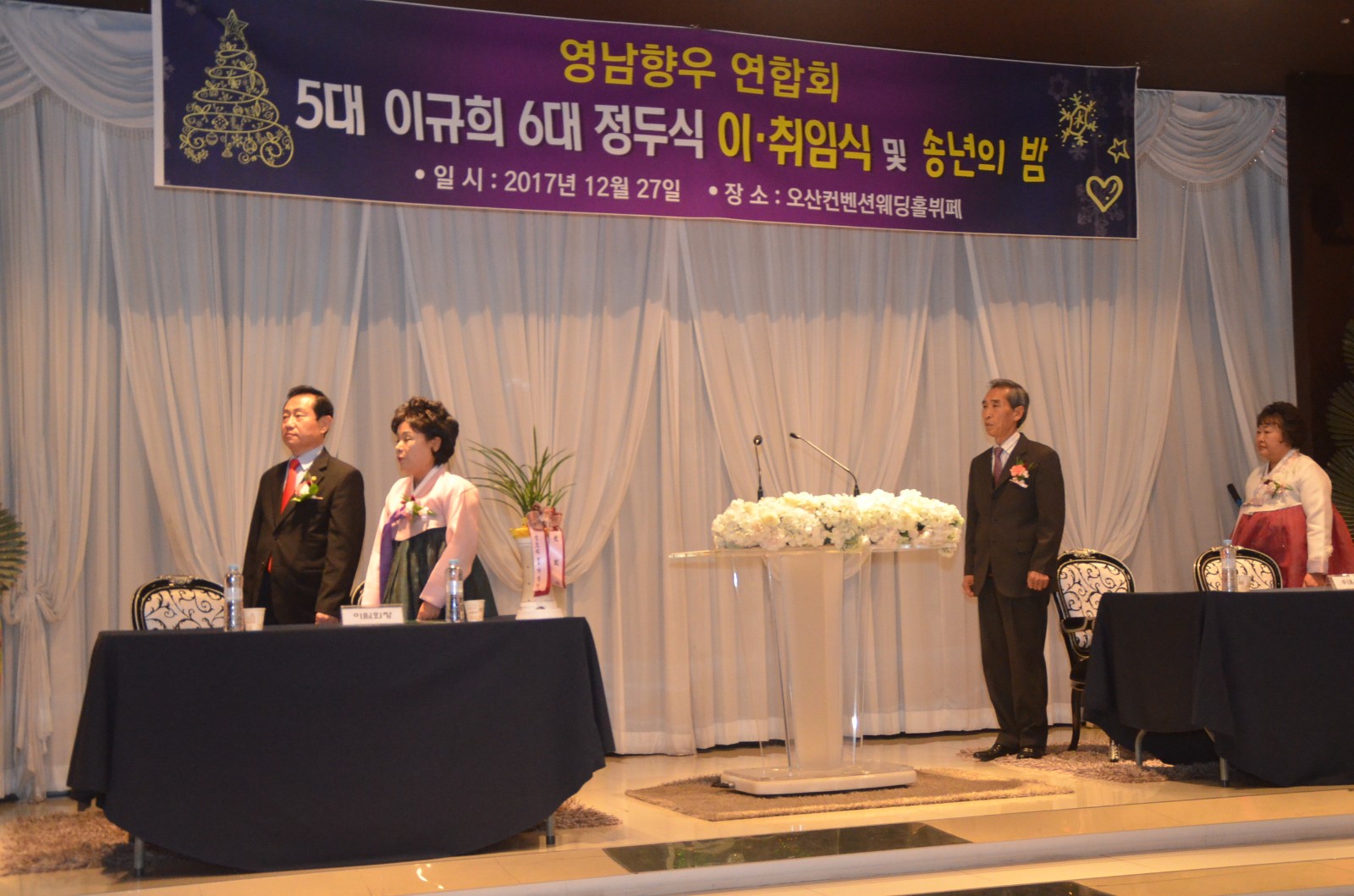 | 27일 오후 오산 컨벤션 웨딩홀 4층에서 「제5대·6대 회장 이˙취임식 및 양인과 함께하는 송년회」에서 이규희 회장 부부(좌측), 정두언 회장 부부(우측)가 국민의례 의식을 하고 있다. <사진=저작권자 ⓒ미디어타임즈> |