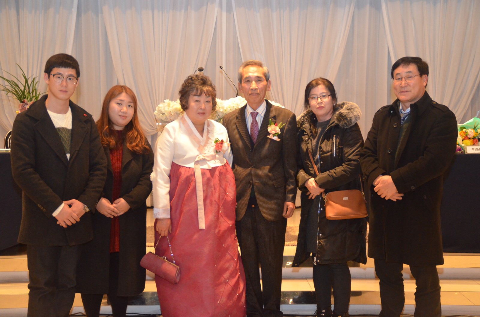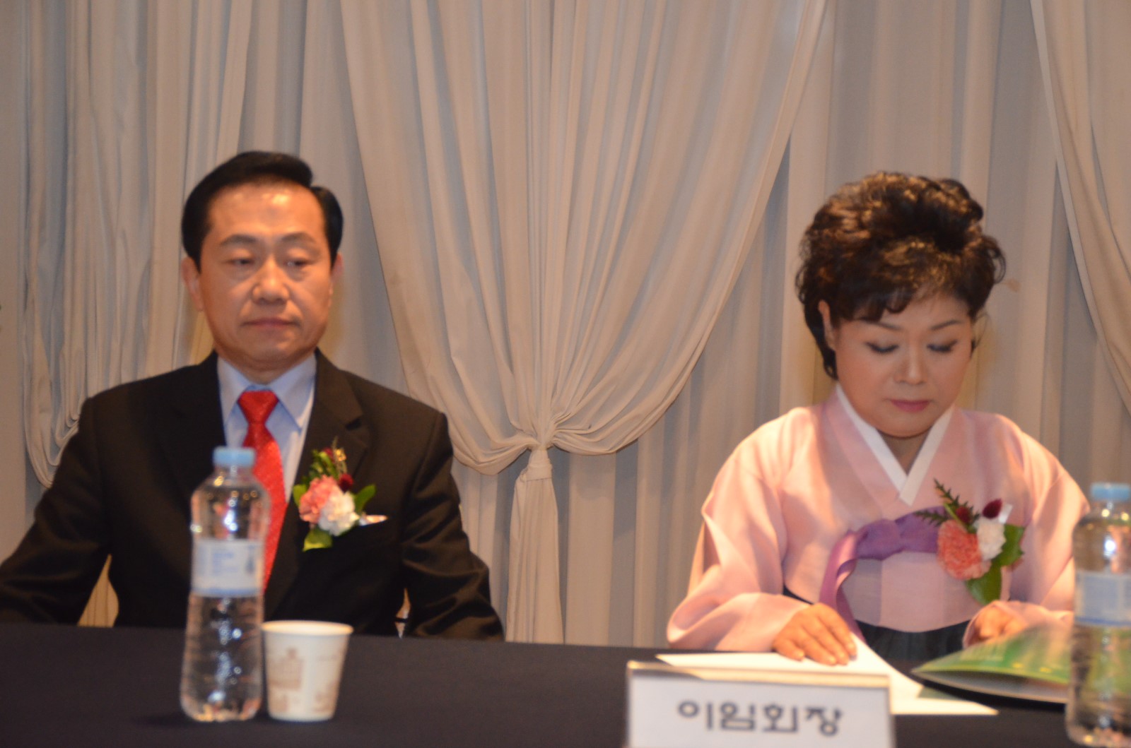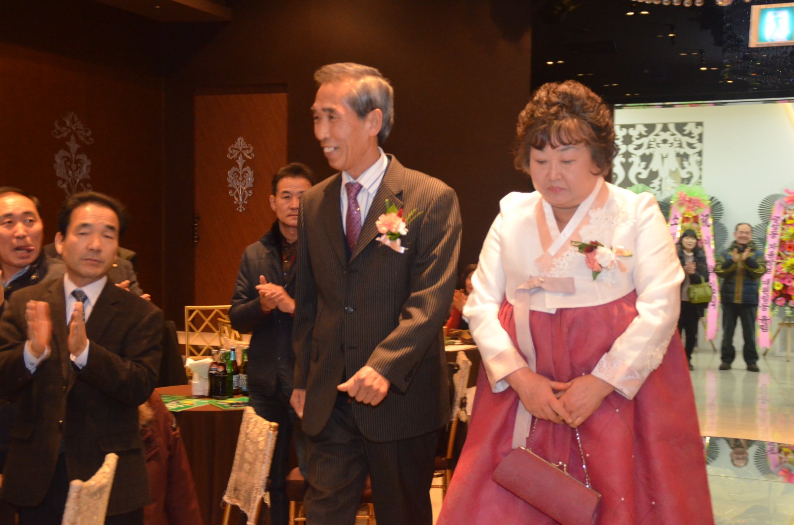 | 27일 오후 오산 컨벤션 웨딩홀 4층에서 「제5대·6대 회장 이˙취임식 및 양인과 함께하는 송년회」에서 이규희 회장 부부(좌측), 정두언 회장 부부(우측)가 국민의례 의식을 하고 있다. <사진=저작권자 ⓒ미디어타임즈> |