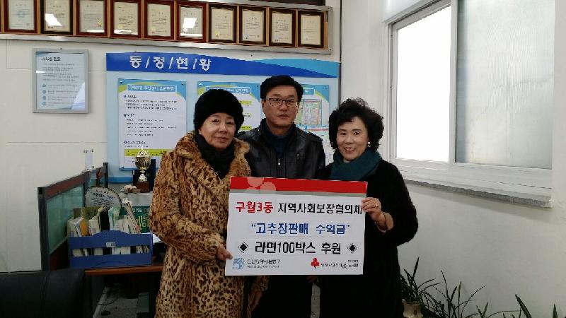 구월3동 지역사회보장협의체(위원장 주영미)에선 위원들이 직접 고추장을 정성껏 만들어 판매해, 그 수익금으로 라면 100박스를 구입해 후원했다.