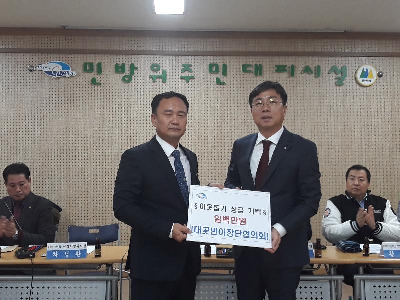 [미디어타임즈= 이옥수 기자] 대곶면이장단협의회(회장 차성환)가 금년에도 어김없이 복지 소외 계층을 위한 성금 100만원을 지난 26일 면사무소에 기탁했다.