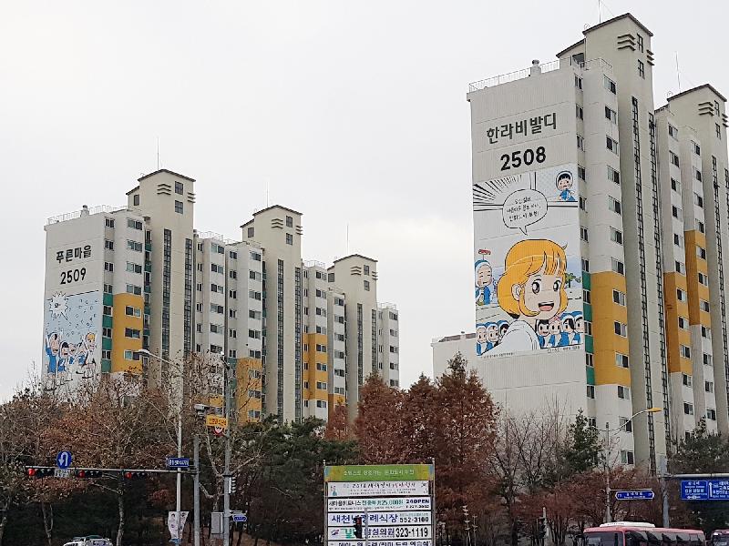 부천시는 올해 송내대로에 인접한 푸른마을, 포도마을 등 5개 아파트단지 10개동 외벽에 만화벽화를 조성했다.