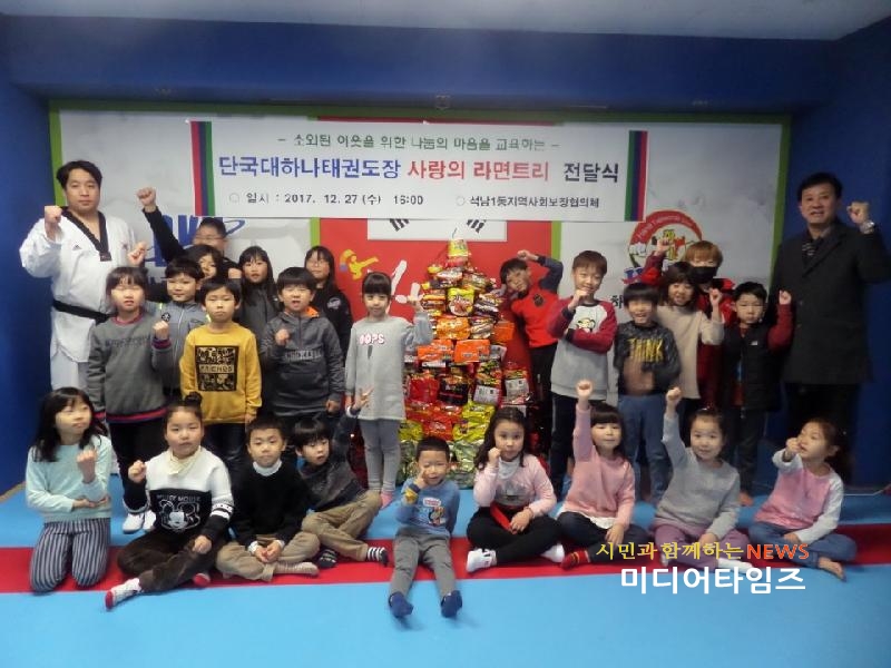 | 단국대 하나태권도 사랑의 라면트리 전달 모습.<ⓒ미디어타임즈> |
