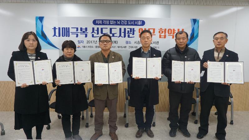 [미디어타임즈= 이옥수 기자] 시흥시 치매통합지원센터에는 치매 친화적 환경 조성을 위하여 공공도서관 4개 기관(중앙·능곡·대야·군자도서관)과 ‘치매극복 선도도서관 운영’을 위한 협약을 체결했다.