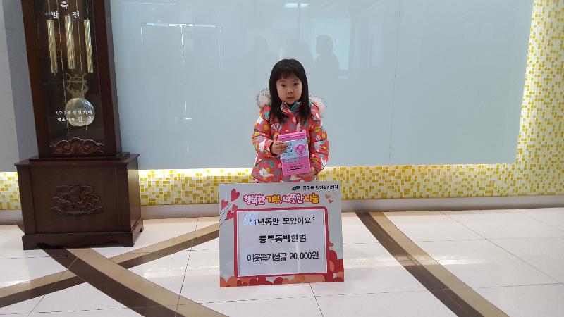 [미디어타임즈= 이옥수 기자] 5살 어린이가 1년간 모은 용돈을 풍무동행정복지센터에 기탁해 주위를 놀라게 하고 있다. 작년 12월에 풍무동으로 이사 온 5살 박한별 어린이는 지난 1년간 부모님에게 받은 용돈을 어려운 이웃을 위해 기부하겠다는 목표로 차곡차곡 저금통에 모아왔다.