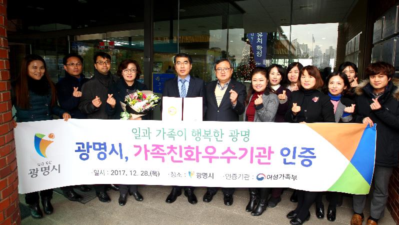 가족친화인증은 여성가족부에서 가족친화제도를 모범적으로 운영하는 공공기관 및 기업에 대해 심사를 통해 인증을 부여하는 제도다. 광명시는 2017년 6월 가족친화인증을 신청해 서류 및 현장 심사, 온라인 설문조사, 최고 경영자인 양기대 광명시장과 직원 심층 면접을 거쳐 최종 선정됐다.