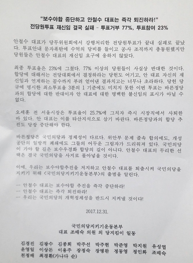 이들은 이날 국회 정론관에서 기자회견을 열고 "당헌당규에 명시된 최소 투표율 '3분의 1' 기준에 못 미친 이번 투표는 바른정당과의 합당에 대한 반대이자, 안 대표에 대한 명백한 불신임의 표시"라고 주장했다.