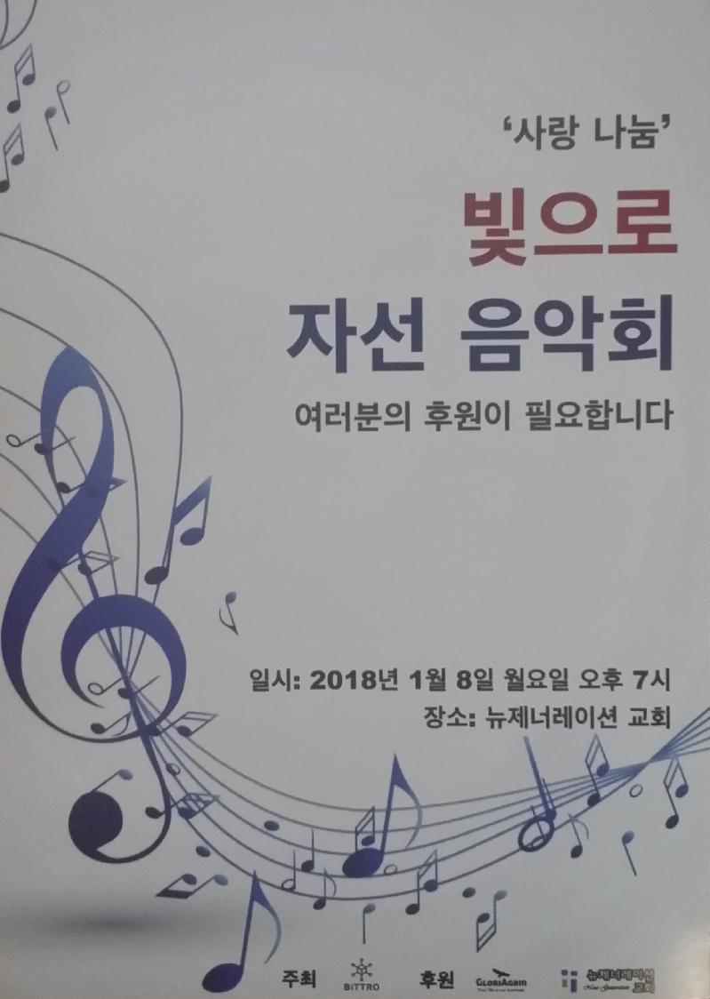 [미디어타임즈=문상수 기자] 뉴제너레이션교회(담임목사 이한수)는 2018년 1월8일(월) 오후 7시에 “사랑나눔 빛으로자선음악회”를 개최한다.이번 자선음악회 행사는 (주)빛으로(BiTTRO)의 주관으로 GLORIAGAIN과 뉴제너레이션교회의 후원으로 진행된다.이번 공연은 클라리넷 김주민(서울대학교 음악대학졸업, 현 빛으로 멤버), 첼로 조재형(빈 시립대학 수학, 서울대학교 석사 졸업, 서울대학교 박사 수료), 해금 홍다슬(한국예술종합학교 예술사 졸업), 메조소프라노 최미란(한양대 음대 졸업, 로마 아카데미아 최고연주자 과정 졸업, 현 고양시합창단 재직중), 색소폰 여요한(서울대학교 음악대학 졸업, 현 에스윗 색소폰 콰르텟 리더), 피아노 윤요한(맨하탄 음대 졸업, 현 빛으로 멤버)등이 연주하며, 연주곡은 Gabriel's Oboe, The Swan, 7080 메들리, Je Te Veux(난 널 원애), Moon River, 내 영혼의 그윽히 깊은데서, 신 아이랑, The Gospel of Grace, Loving You, wn 하나님의 모든세계, Over the Rainbow 등 다양한 공연으로 즐거움을 선사할 예정이다.이번 공연은 뉴제너레이션교회 본당(인천광역시 서구 연희동 767-8 청라국제도시)에서 개최되며, 뉴제너레이션교회 이한수 담임목사는 2018년부터 정기적으로 소외된 이웃을 돕기 위한 자선 콘서트를 열어 수익금 전액을 사회단체 등에 기부할 계획이라고 말했다.또한, 뉴제너레이션교회의 신도들도 “지역 나눔에 함께 동참할 수 있어 감사함을 느끼고, 앞으로도 꾸준한 나눔 활동을 통해 따뜻한 지역사회를 만드는데 기여하고 싶다”고 말했다.